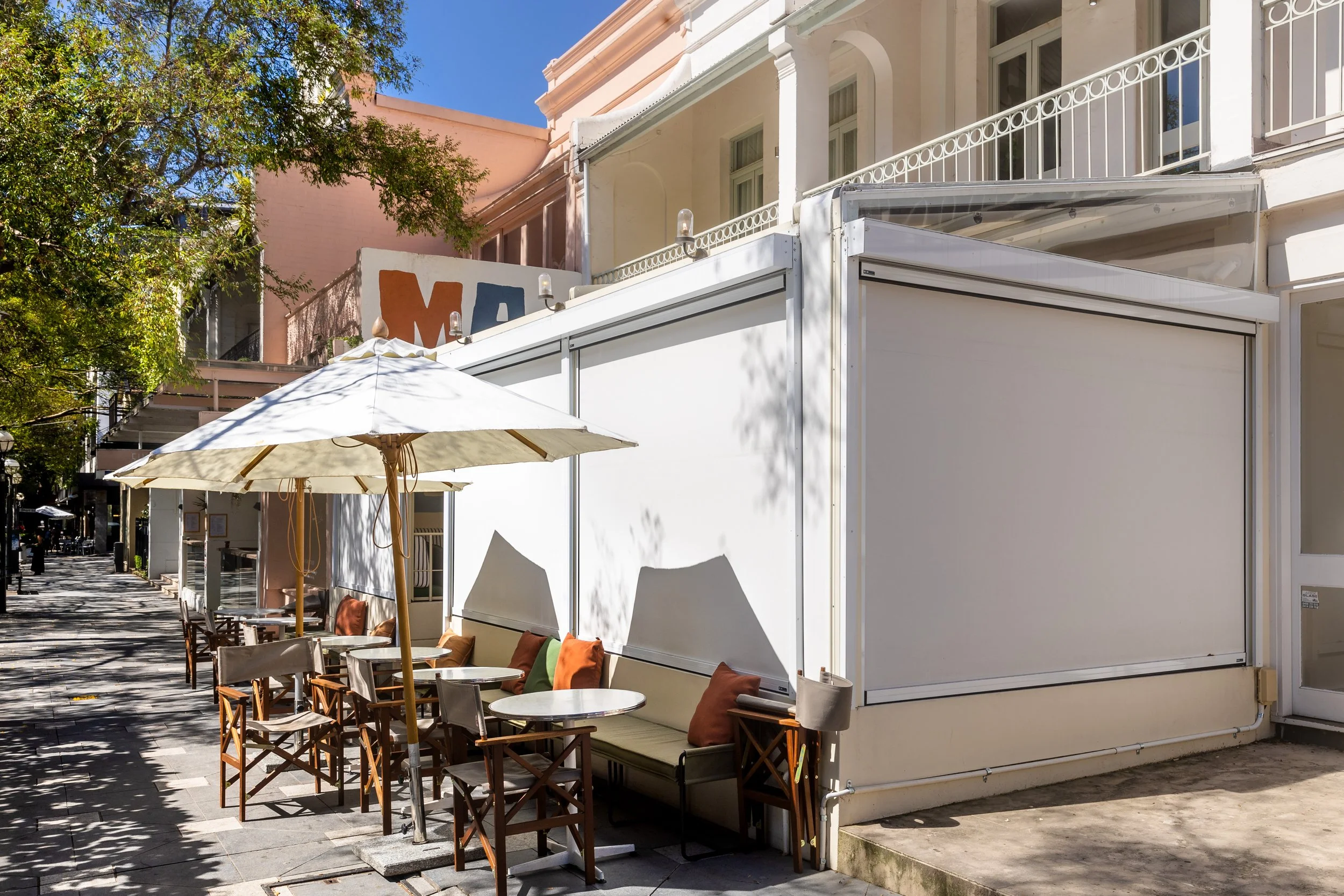 Engineered for demanding conditions, the Zip system provides effective protection from wind, rain, dust, insects, and UV exposure, supporting year-round usability of outdoor spaces while maintaining airflow and outward visibility through fabric selection.